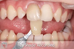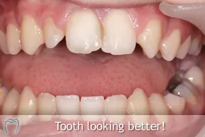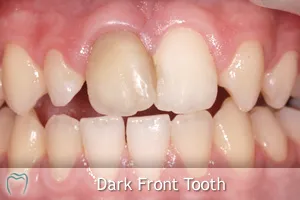 This 14 yr old chap came to visit us at the clinic in 2009. A few months previously, while play-acting in school, he received a bang to his front tooth, causing the nerve in it to die. He had the nerve taken out of the tooth (Root Canal Treatment) but you can see from the images that the tooth has darkened quite significantly. This chap is very unhappy with the appearance of the tooth now and wanted to improve the colour.