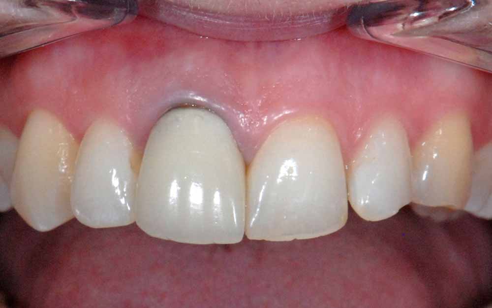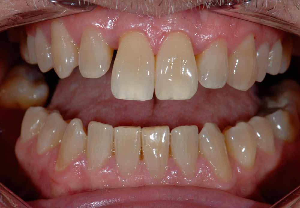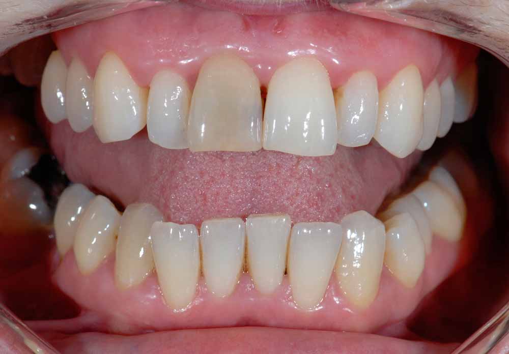 70yr old patient. Layered ceramic crown to replace an ugly looking temporary crown and composite bondings to replace both badly broken down central incisors.