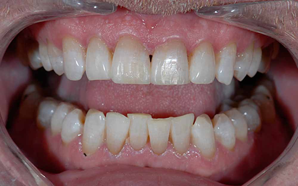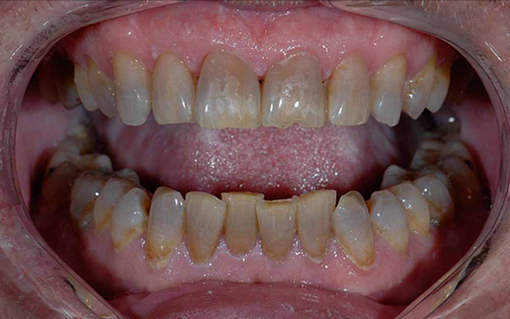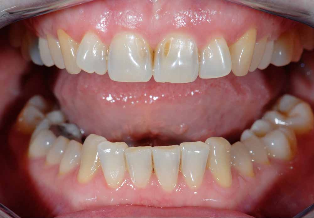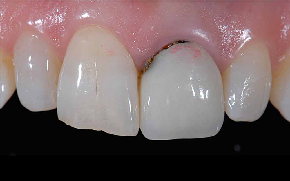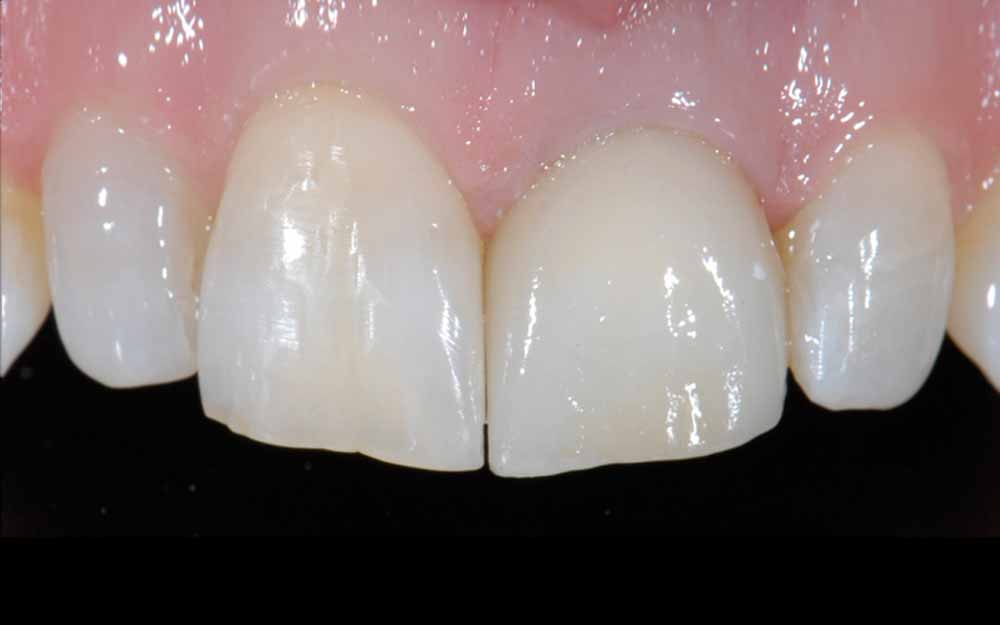 Replacing an old style PFM crown with a layered ceramic crown, in addition to composite bonding to close the unsightly gaps between the teeth.